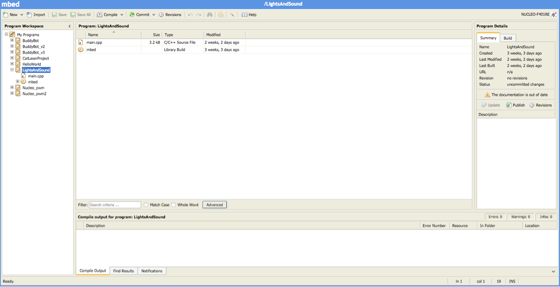 You can head over to mbed.org and create a free account. The nice thing about the Nucleo is that you can use the programming environment in the browser so it’s always up to date. Once you are logged in you should see the “Compiler” link in the top right of the website, click on that. This will open up your workspace where all your projects will reside. From here follow these steps: