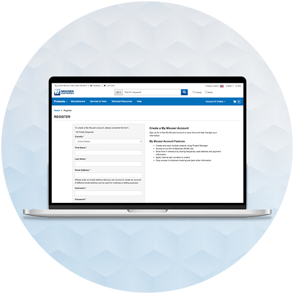 Administre su cuenta de MyMouser desde su portátil: importe listas de piezas, cree listas de materiales, haga seguimiento de pedidos, imprima facturas y acceda a soluciones API.